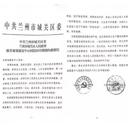 岁寒知松柏,患难见真情。近日,省康复中心医院收到中共兰州市城关区委、区政府的感谢信,对医院在抗击疫情的关键时期,大力发扬“一方有难、八方支援”精神,集结医疗队支援兰州市和城关区抗击疫情所作出的努力和贡献表示衷心的感谢。