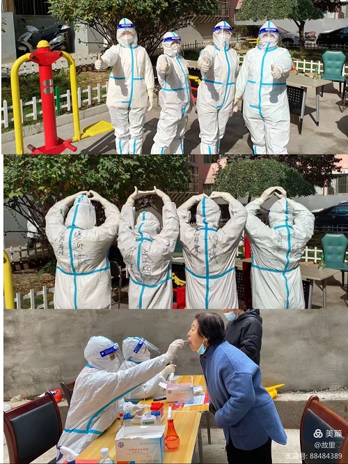 “疫”不容辞,责无旁贷。新一轮疫情出现后,省康复中心医院骨外科陈文博、马蕊蕊、张迎霞三名同志闻令而动、应令而战,汇聚力量积极投入医院驰援兰州市为重点人群开展核酸检测的抗疫洪流中。在接下来的十余天里,他们穿戴着密不透气的防护服,在十月的寒风中一站就是十余个小时,湿气布满面屏。当繁星未退之时,他们毅然出发,直奔目的地;当皓月高挂天空、寒风瑟瑟敲打枝叶之时,他们仍然坚守在岗位,有时一守就是连续24个小时。他们与日月相伴,与时间赛跑,与病毒做着殊死的较量,只为坚守医者那明亮的初心,守护好生命的珍贵。每当问及他们累不累时,他们总是强硬地挺起已经累得不想动弹的身板,用喊得已经嘶哑的声音,喘着粗气,微笑着说:“我们是骨科人,我们的骨骼比一般人要坚硬,不会轻易趴下,我们累并快乐着,疫情不散,我们‘硬核’到底……”